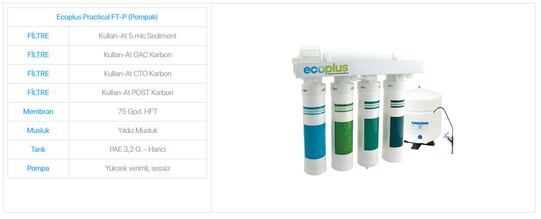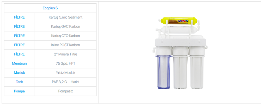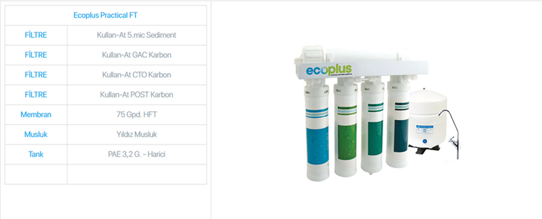 Ecoplus 5 Aşamalı Su Arıtma Cihazı, şebeke suyununızu 5 aşamadan geçerek istendiği taktirde 8 aşamaya kadar filtre edebilen varyasyon seçenekleri bulunmaktadır. Mutfak tezgahının altında oldukça az yer kaplar. Çalışması için elektriğe ihtiyaç duymamaktadır. Tasarımı oldukça güzel olup fonksiyonellik bakımından harikadır. İnsana enerji veren su, besin maddelerini ve oksijeni tüm vücuda taşıyan hayati bir sıvıdır. Hem lezzetli hem de sağlıklı su temin Ecoplus 5 Aşamalı Su Arıtma Cihazı, istenilen miktarda su sağlar ve inline filtre sistemi ile filtreleri kolay değiştirilen kaliteli ve güvenilir bir üründür.